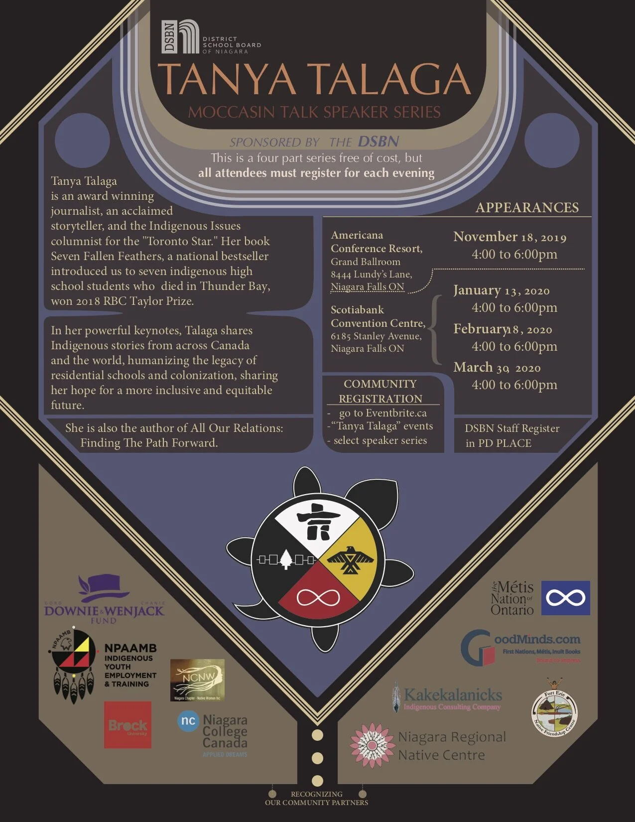 The Moccasin Talks Speaker Series explores a wide range of Indigenous issues involving history, cultural practices and protocols, and contemporary issues during interactive and poignant community dialogues at libraries and community centres. These talks are led by Indigenous elders, scholars, professionals, residential school survivors, and a host of conveners with stories to tell. The Moccasin Talks aim to advance reconciliation by examining the relationship between indigenous peoples and Canadian society. Audience members have the opportunity to interact during the Q&As and are encouraged to ask questions which seek to bring clarity to people about some very difficult realities we all need to face together in order to move forward in strength, peace, harmony, friendship, and unity. Implementation of this series and other integrated programming has been conducted in partnership with the Niagara-on-the-Lake Public Library, Niagara Falls History Museum, Niagara Falls Public Library, and St. Catharines Public Library, with several other municipalities and organizations expressing interest